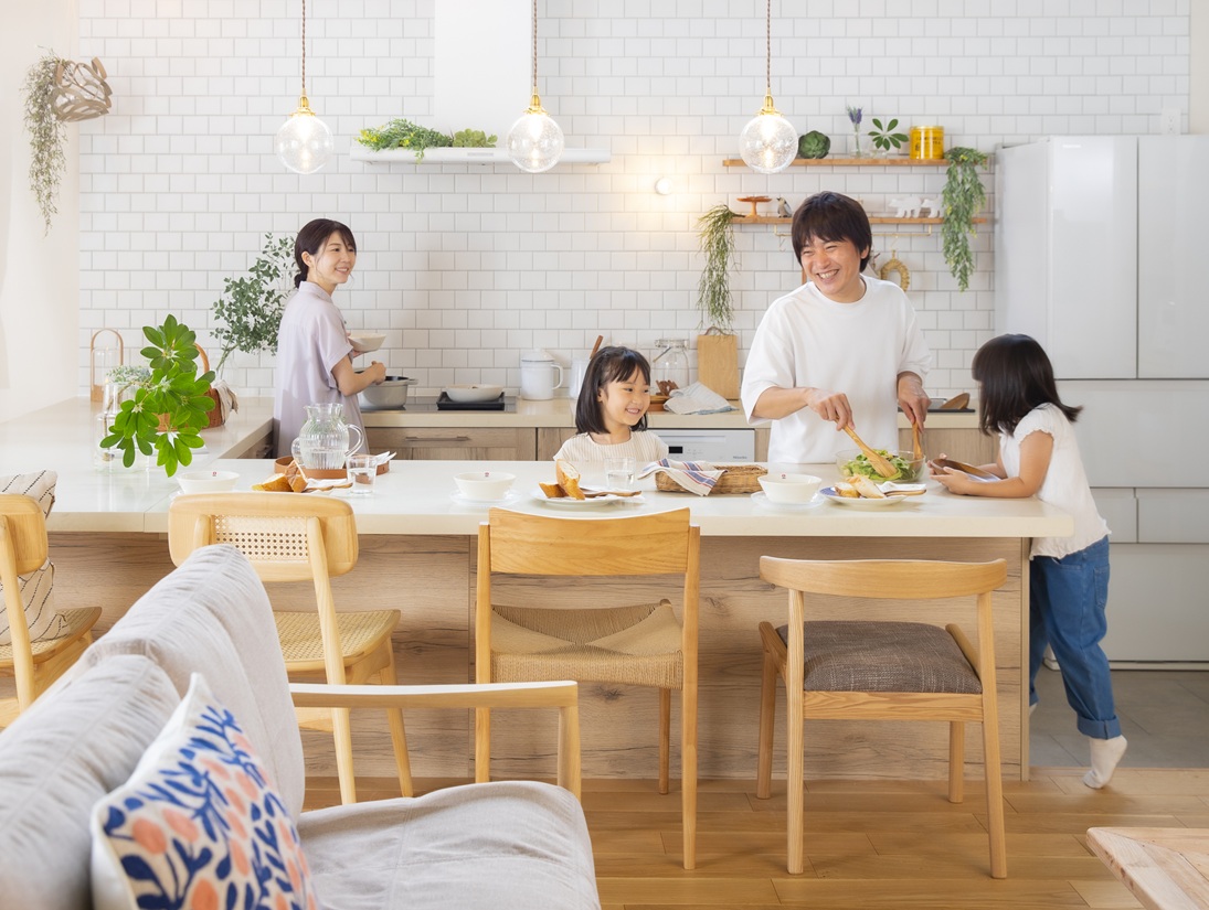 キッチンのデザインは、ただのパズルのような配置ではありません。家族が集まる場所だからこそ、その設計には家族とのつながりを深める工夫が必要です。例えば、キッチンの床を少し下げることで、カウンターで宿題をするお子さんと目線を合わせながら家事ができる空間を作ることができます。食事の支度の様子がお子さんの目に入る配置なら、自然とお手伝い上手になってくれますよ。キッチンやダイニングテーブルの配置を工夫することで、家族の動きがスムーズになり、より多くの時間を一緒に過ごすことができるようになります。